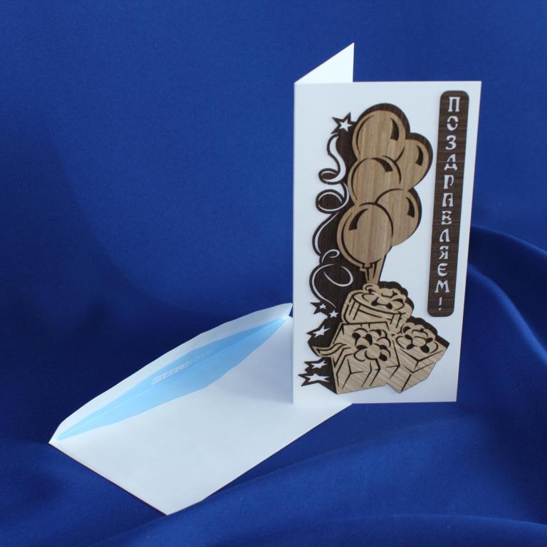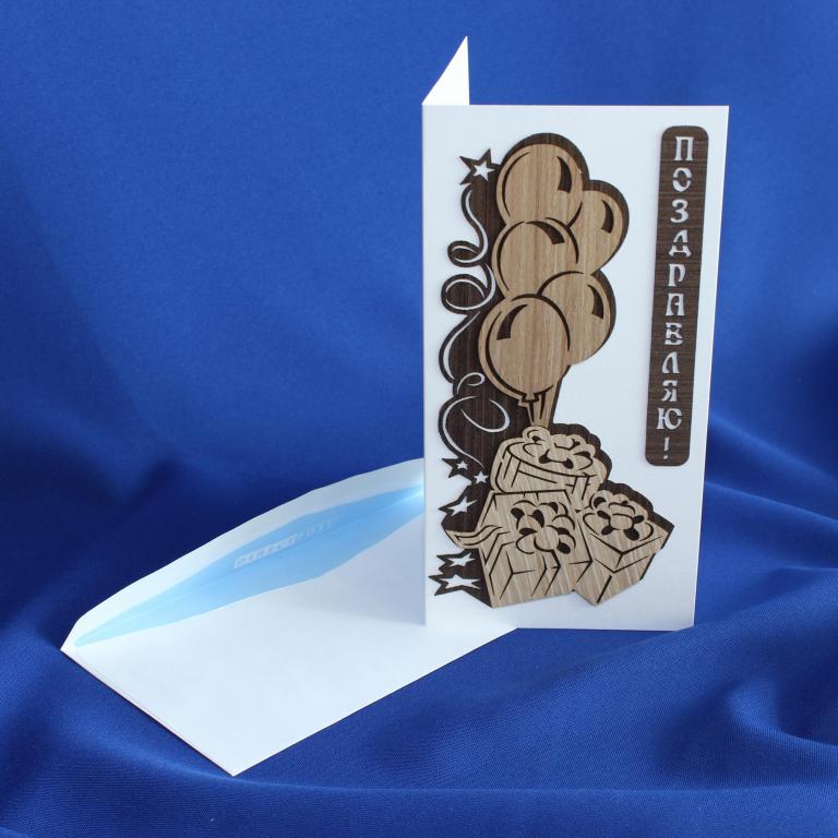 Каталог / Открытки / Открытки с элементами шпона / Объемные открытки из шпона / Открытка Поздравляем! Шары и подарки