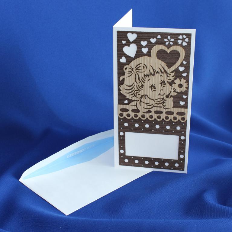 Каталог / Открытки / Открытки с элементами шпона / Объемные открытки из шпона / Открытка Девочка с цветочком