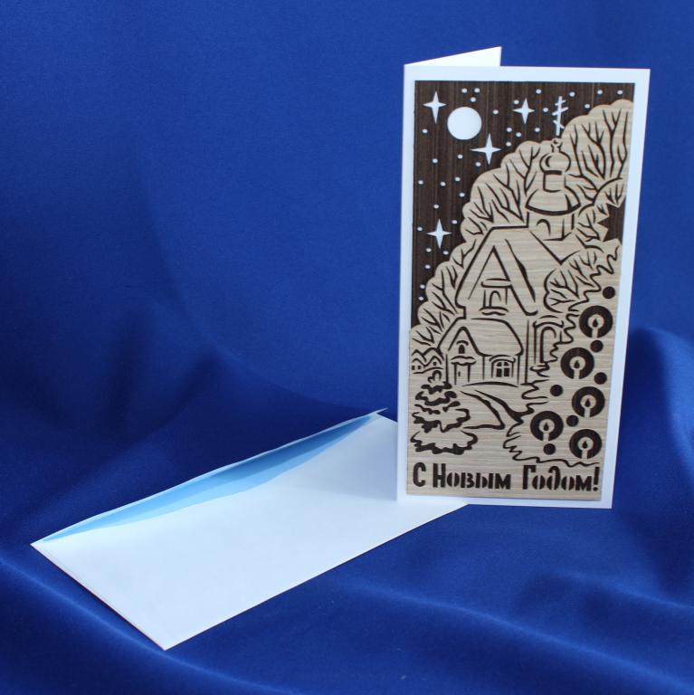 Каталог / Открытки / Открытки с элементами шпона / Объемные открытки из шпона / Открытка С новым годом! зимний пейзаж