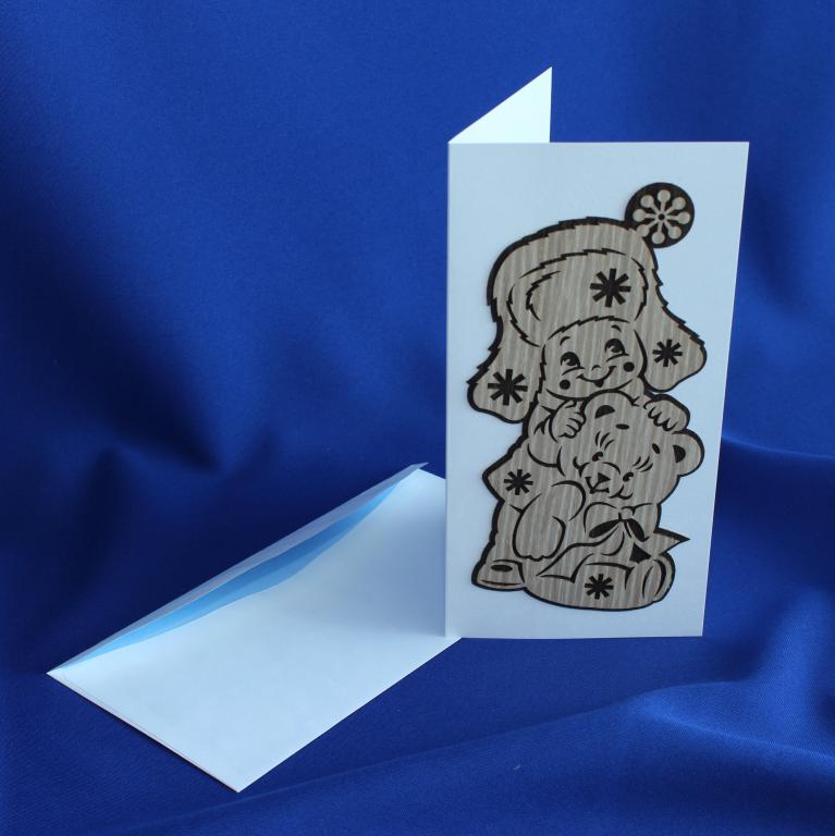 Каталог / Открытки / Открытки с элементами шпона / Объемные открытки из шпона / Открытка Девочка с мишкой