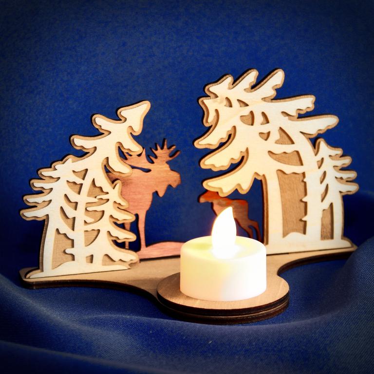 Каталог / Подсвечники / Подсвечники новогодние и рождественские с элементами шпона / Подсвечник "Лоси в лесу"